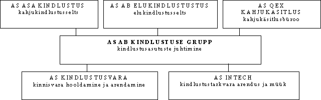 Emitendi aktsiakapitalist 50.5% kuulub AB Kindlustuse Grupile. Üldandmed AB Kindlustuse Grupi AS (edaspidi "Grupp") juriidiline aadress on Narva mnt 108. Grupp on registreeritud Äriregistris 14.03.1997.a. registrinumbriga 10190220 Grupi majandusaasta algus on 1. jaanuar ning lõpp 31. detsember. Grupp loodi omanike poolt sarnase omandistruktuuriga ettevõtete tegevuse tõhustamiseks. Grupi tasemel teostatakse tütarettevõtete strateegilist planeerimist, kapitaliseerimist, investeerimispoliitikat ning muid üldfunktsioone. Seoses sellega on Grupp sõlminud lepingu tütarettevõtetega, mille kohaselt nimetatud funktsioonid lähevad järk-järgult üle Grupi tasemele. Kehtiv leping on alla kirjutatud 29. augustil 1997, lepingujärgne kuumaks on 600 tuhat krooni, mis jaguneb tütarettevõtete vahel. Emitent on osaliselt üle andnud investeerimise, kaadri väljaõppe, turundustegevuse ja avalike suhete juhtimise. Emitent tasub Grupile teenuste osutamise eest lepingujärgseid makseid, mis on 60% kogu kuumaksust, seega 360 tuhat krooni kuus ehk 4.32 miljonit krooni aastas. 1997. a 9 kuuga on Emitent tasunud Grupile teenustasudena 2.69 miljonit krooni. Peale Emitendi omab Grupp kontrollosalust ka AB Elukindlustuse AS-is (Eesti suuruselt teine elukindlustusfirma) – 67.7%, kahjukäsitlusfirmas Qex – 52%, kindlustustarkvara arendus- ja müügifirmas AS Intech – 100% ning grupi kinnisvara haldavas firmas AS Kindlustusvara – 80%. Tütar- ja sidusettevõtete tutvustus AS AB ELUKINDLUSTUS Nõukogu esimees – Leonid Apananski; Nõukogu liikmed – Leon Glikman, Sergei Netshajev Juhatus - juhataja, peadirektor Mati Vihul AS AB Elukindlustus moodustati 1992. a lõpus Tallinnas nime all AS BLIG (Baltic Life Insurance Group). Aktsiakapital on suurenenud 100,000 krooniselt algkapitalilt 21 miljoni kroonini. AB Elukindlustus on kogutud brutopreemiate järgi suuruselt teine elukindlustusfirma. AB Elukindlustus pakub järgmisi elukindlustusteenuseid: kindlustus surmajuhtumiks, kapitalikogumiskindlustus, pensionikindlustus, kindlustus õnnetusjuhtumi vastu. AS AB Elukindlustuse käive 1996. aastal oli 11,5 miljonit ning kahjum 1.6 miljonit. 1997. a I poolaasta käive oli 9.2 miljonit ja kasum1.5 miljonit krooni. Majanduslikud suhted Emitendiga puuduvad AS QEX KAHJUKÄSITLUS Nõukogu liikmed - M. Vihul, S. Netsajev, O. Susi Juhatus – peadirektor Andres Merilo Kunagisest ASA Kindlustuse liikluskindlustuse osakonnast välja kasvanud AS QEX on Eesti üks suuremaid kahjukäsitlusbüroosid, mille peamiseks ülesandeks on kindlustusfirmade liikluskahjude käsitlemine ja hindamine. AS QEX asutati 1993. aastal. Lisaks teeninduskeskusele Tallinnas on QEX-il esindajad ka Tartus, Viljandis, Pärnus, Rakveres, Saaremaal, Hiiumaal, Haapsalus ning Narvas. Emitendil on leping QEX-iga kahjukäsitlusteenuste osutamise kohta viimase poolt. Emitendi poolt on QEX-le tasutud 1996. aastal 3.2 miljonit krooni, 1. oktoobri seisuga 1997 on tasutud 2.8 miljonit krooni. QEX on Emitendile tasunud 1996. aastal 1 miljon krooni ja 1. oktoobri 1997. a seisuga 1.2 miljonit krooni. Tehingud on toimunud turuhindadega, vastavalt rahvusvahelistele kahjukäsitlustariifidele. AS QEX Kahjukäsitluse 1996. asta käive oli 4.4 miljonit ning kahjum 0.4 miljonit krooni. 1997.a I poolaasta käive oli 3.7 miljonit ning kasum 0.2 miljonit krooni. AS KINDLUSTUSVARA Nõukogu – L. Apananski, T. Tsernõsev, M. Vihul Juhatus – peadirektor Matti Pedak 1996. aasta alguses tegevust alustanud AS Kindlustusvara tegevuse eesmärgiks on valdusfirma juures täita peamiselt kinnisvaraga seonduvaid tugifunktsioone. AS Kindlustusvaral ei ole plaanis sekkuda Eesti kinnisvaraturule teenuse pakkujana, pigem saavutada tase valijana. AS Kindlustusvara 1997. a I poolaasta käive oli 35 tuhat krooni ning kasum 15 tuhat krooni. Majanduslikud suhted Emitendiga puuduvad. AS INTECH Nõukogu – S. Netsajev, L. Apananski, Eduard Gorobets Juhatus – peadirektor Jüri Turovski Asutatud Septembris 1997. a. aktsiakapitaliga 400,000 krooni. Põhitegevuseks on infotehnoloogiaalaste teenuste osutamine, tarkvara arendamine. Tegevuse eesmärgiks on välja arendada ühtne infosüsteem Grupi firmade vahel. Majanduslikud suhted Emitendiga puuduvad.