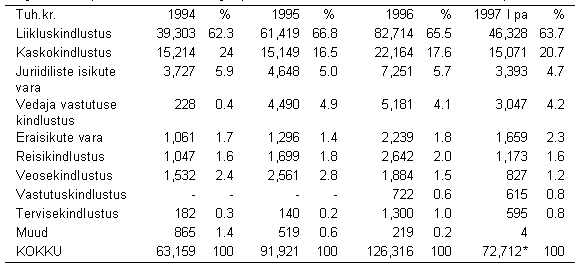 LISA 4: Koondtabel – kahjukindlustuse mittetehniline aruanne 1994, 1995, 1996, I p.a. 1997 Kahjukindlustuse mittetehniline