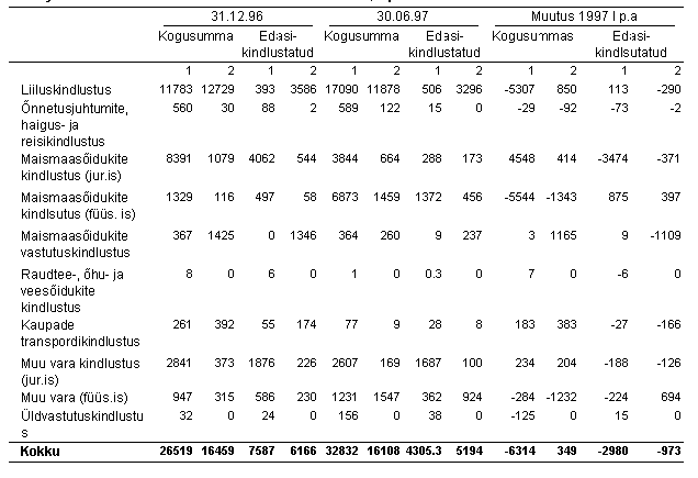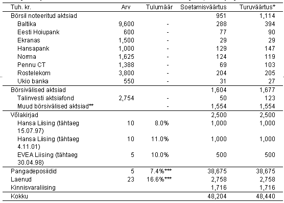 ** Sisaldab ka 140 400 AB Elukindlustuse AS aktsiat nimiväärtusega 10 krooni. AB Elukindlustuse AS kuulub Emitendiga samasse AB Kindlustuse Gruppi. Seisuga 04. november 1997 on 96 400 AB Elukindlustuse AS aktsiat müüdud avalikkusele. *** Kaalutud keskmine tulumäär. Erinevus 1997. a. I poolaasta bilansiaruandes toodud investeeringute jaotuses ülaltoodud tabeliga võrreldes on tingitud erinevate väärtpaberite arvestamisega erinevatel väärtpaberite (haldus)kontodel (kasutusel on ASA Kindlustuse, AB Kindlustuse Grupi ja Bonman Investi väärtpaberikontod).