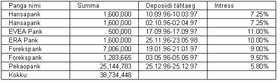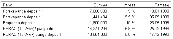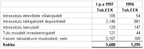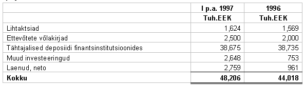(Vaata märkus 12) Ettevõtete võlakirjad koosnevad kahest Hansa Liisingu (liisingfirma) võlakirjast tähtajaga 1 aasta ja 5 aastat aastase intressimääraga vastavalt 8% ja 11% ning EVEA Liisingu (liisingfirma) võlakirjast tähtajaga 1 aasta ja aastase intressimääraga 10%. Seisuga 30. juuni 1997. a. on tähtajalised deposiidid finantsinstitutsioonides tähtajaga 6 kuud kuni 2 aastat intressimääradega vahemikus 5.8 % kuni 11 %.