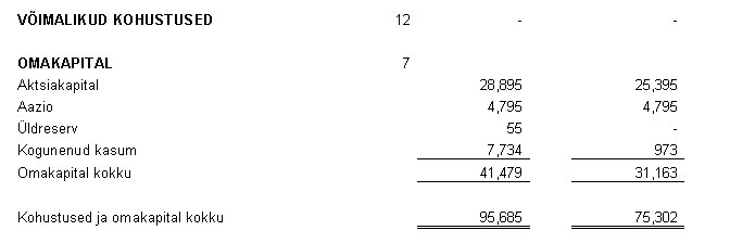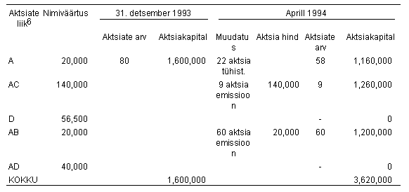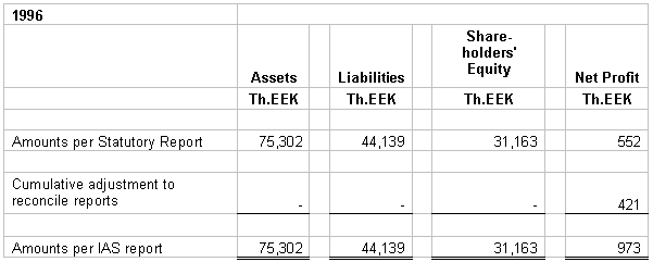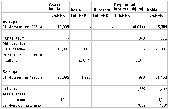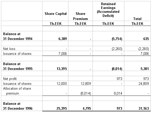 7. SHAREHOLDERS’ EQUITY The Company increased it’s share capital during 1996 by 24,809 Th.EEK through the issuance, for cash, of 300 AD series shares with a nominal value 12,000 Th.EEK and share premium of 12,809 Th.EEK. The Company increased it’s share capital during 1995 by 7,006 Th.EEK through the issuance, for cash, of 124 D series shares with a nominal value 7,006 Th.EEK. In 1996 the Company allocated from share premium 8,014 Th.EEK to retained earnings to cover the accumulated deficit of previous periods.