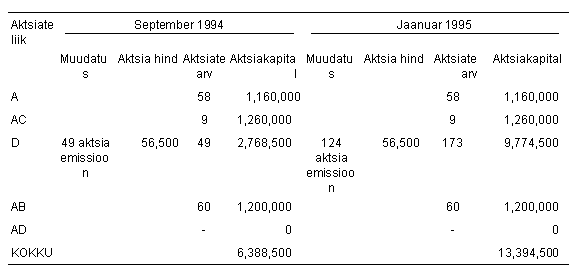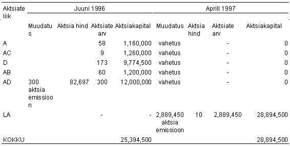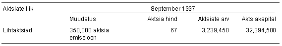 Üldkoosoleku otsusega 25. aprillist 1997 vahetati kõik muud aktsiad välja 10-kroonise nimiväärtusega lihtaktsiate vastu ning emiteeriti selleks 2 539 450 lihtaktsiat. Sama koosoleku otsusega suurendati aktsiakapitali suunatud emissiooni teel 3 500 000 krooni võrra ja emiteeriti selleks 350 000 uut lihtaktsiat. Kuna viimati nimetatud emissiooni puhul oli tegemist suunatud emissiooniga olemasolevatele aktsionäridele, ei kaasnenud sellega otseseid emissioonikulusid. Aktisad müüdi nimiväärtusega.