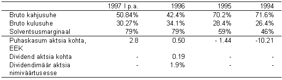 Emitent võib maksta oma aktsionäridele dividende vastavalt üldkoosoleku poolt vastu võetud kasumi jaotamise otsusele. Kasumi jaotamise ettepaneku esitab üldkoosolekule juhatus, Nõukogul on õigus teha sellesse enne üldkoosolekule esitamist muudatusi. Kasumi jaotamise otsuse võtab üldkoosolek vastu kinnitatud raamatupidamise aastaaruande alusel. Kõik Emitendi Aktsiad kannavad võrdset õigust dividendidele. Emitendi võime maksta dividende sõltub Emitendi vastava majandusaasta edukusest, finantsolukorrast ning muudest vastavatest teguritest. Emitendi juhatus ja Nõukogu võivad otsustada, et Emitendi majandusliku edukuse huvides on otstarbekas dividende vastava majandusaasta eest mitte maksta ning saadud tulu reinvesteerida. Sellisel juhul võib Emitendi juhatus teha Emitendi aktsionäride üldkoosolekule ettepanek vastava majandusaasta eest dividende mitte maksta. Aktsionäride üldkoosolek 24. aprillil 1997. a. otsustas 1996. aasta kasumist jaotada dividendideks 480,000 Eesti krooni. Vähemusaktsionäride kaitse AB Kindlustuse Grupp, kes omab 50.5% Emitendi aktsiakapitalist on sõlminud AS-iga Hansa Investments Vähemusaktsionäride kaitse lepingu, kus on määratletud AS-i Hansa Investments õigus nimetada esindaja (mitte tingimata AS Hansa Investments juhtorganite liige), kelle AB Kindlustuse Grupp peab esitama Emitendi nõukogu liikme kohale järgmisel aktsionäride üldkoosolekul ning selle poolt ka hääletama.Maksustamine Alljärgnev kokkuvõte käsitleb mõningaid maksuaspekte mis on seotud Emitendi aktsiate ostmise, omamise ning võõrandamisega vastavalt maksualasele seadusandlusele mis on kehtiv 15. oktoobril. Võimalikud tulevikus toimuvad muudatused vastavates seadusandlikes aktides võivad oluliselt muuta allpooltoodud seisukohti ja järeldusi. Käesolev kokkuvõte ei pretendeeri olema juriidiline seisukohavõtt ega katma kõiki võimalikke maksuaspekte mis võivad olla seotud investeeringuga Emitendi aktsiatesse. Tulumaks Praegu jõusolev Eesti Tulumaksuseadusele (8. detsembrist 1993) käsitleb ettevõtete ning eraisikute poolt saadavat tulu võrdsetel alustel ja see on maksustatav määraga 26%. Tulu aktsia hinna tõusust Realiseerunud tulu aktsia hinna tõusust käsitletakse kui tulu Eesti Tulumaksuseaduse tähenduses (§9 lõige 1 ja §10) ning see kuulub maksustamisele tulumaksuga. Mitteresidentidest eraisikute poolt saadav tulu aktsia hinna tõusust kuulub maksustamisele aktsiate võõrandamisel. Dividendid Eesti Tulumaksuseaduse kohaselt peab Eesti ettevõte dividendide väljamaksmisel maksma tulumaksu 26/74 dividendide summast. Maksumaksja, kes saab ettevõtte aktsiatelt dividende, on kohustatud saadud dividendid deklareerima maksustamisele mittekuuluva tuluna. Aktsiate võõrandamine Aktsiate võõrandamine ei ole Eesti Vabariigis maksustatav riigilõivu ja käibemaksuga.Finantsinformatsioon Tingituna sõlmimiskulude ja edasikindlustajatelt saadud komisjonitasude periodiseerimise vajadusega vastavalt rahandusministri määrusele nr.17 13. veebruarist 1997 on 1996. aasta algbilanss (1995. aasta lõppbilanss) ning vastav kasumiaruanne ümber hinnatud. 1994. aasta aruannetes vastavat ümberhindlust pole tehtud. Valitud finantsnäitajad