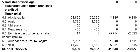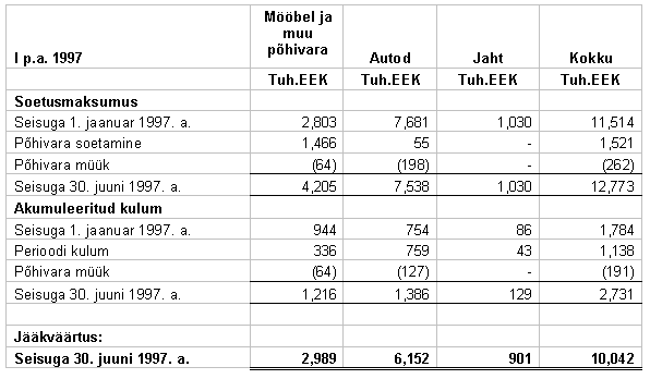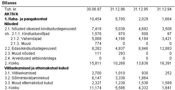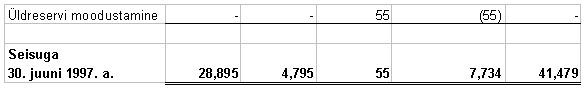 7. OMAKAPITAL Firma suurendas oma aktsiakapitali 1997. aastal 3,500 tuh.EEK võrra emiteerides sularaha eest 350,000 LA seeria aktsiat nominaalväärtusega 3,500 tuh.EEK. Firma suurendas oma aktsiakapitali 1996. aastal 24,809 tuh.EEK võrra emiteerides sularaha eest 300 AD seeria aktsiat nominaalväärtusega 12,000 tuh.EEK ja aaž ioga 12,809 tuh.EEK. 1997. aastal vahetas Firma erinevate seeriate lihtaktsiad LA seeria aktsiateks nominaalväärtusega 100 EEK. Seisuga 30. juuni 1997. a. koosnes aktsiakapital 2,889,450 aktsiast nominaalväärtusega 28,894 tuh.EEK. 1996. aastal kandis Firma 8,014 tuh.EEK aaž iost jaotamata kasumi kontole, et katta eelnevate perioodide kogunenud kahjum.