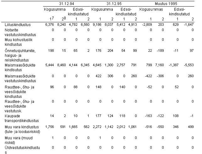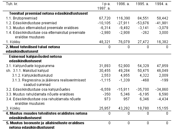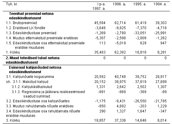 LISA 10: Kahjukindlustuse tehnilise eraldiste aruanne 31.12.1994, 31.12.1995, 31.12.1996, 30.06.1997 Kahjukindlsutusliikide tehniliste