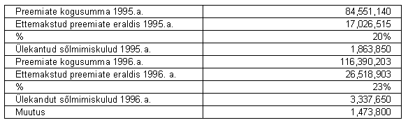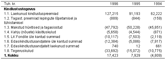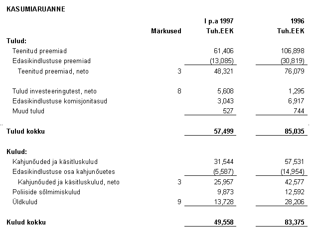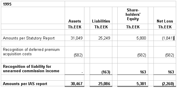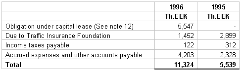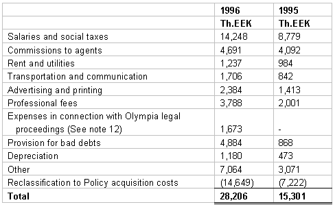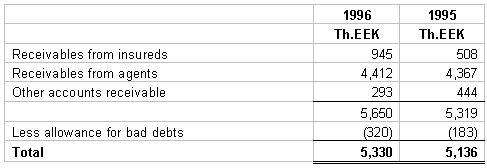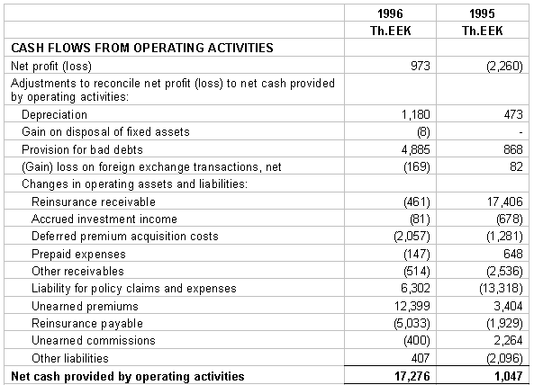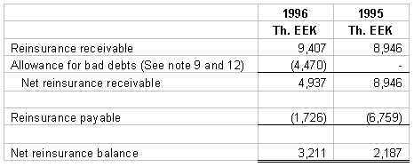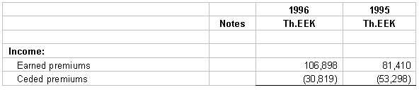 10. TAXATION The Estonian income tax law imposes an income tax of 4 % on the net premiums earned (5% on the earned premiums in 1995) during the calendar year irrespective of income or loss. The income tax expense included in these financial statements is based on all income that is taxable. Premiums collected for compulsory traffic insurance are excluded from taxation as indicated in the statues. The income tax expense computed by applying the tax rates to taxable income in 1996 and in 1995 is 687 Th.EEK and 1,515 Th.EEK, respectively. 11. RELATED PARTY TRANSACTIONS Related parties are defined as shareholders, members of the supervisory board, members of the management board, their close relatives, and companies in which they have a controlling interest. During the years ended 1996 and 1995 the Company expensed 2,191 Th.EEK and 2,437 Th.EEK respectively, to a related company for services rendered in conjunction with claims adjusting, net of the proceeds from sales of damaged automobiles to this company. Additionally the Company has payables to this company of 1,452 Th.EEK and 942 Th.EEK at 31 December 1996 and 1995, respectively. During 1996 the Company paid 625 Th.EEK to related parties as defined above for professional consulting services.