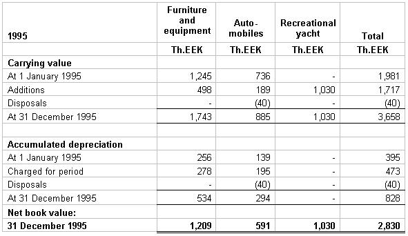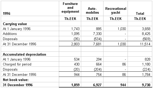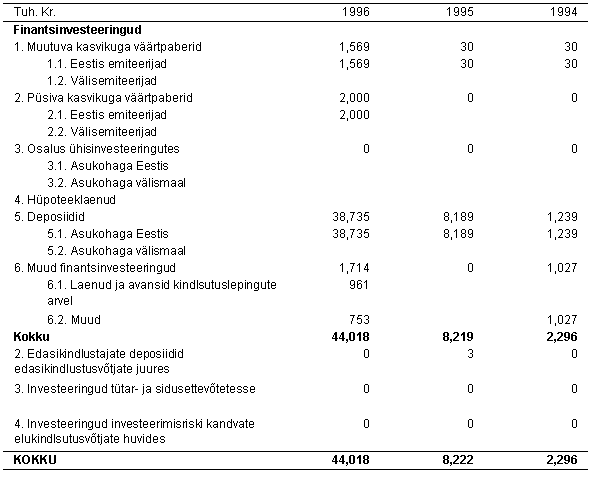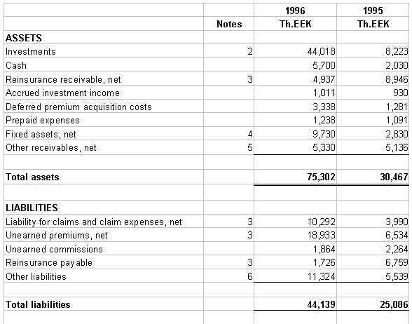 1. SUMMARY OF SIGNIFICANT ACCOUNTING POLICIES ASA Insurance Company ("the Company") was founded in January 1992 on the base of Est-Ind insurance Company operating since 1991. The company is authorized to provide non-life insurance products including motor third party liability insurance. The Company’s principle products are auto/third party liability insurance, property insurance, cargo/carrier insurance and travel insurance. Basis of operation - The financial statements have been prepared on the historical cost basis of accounting, in accordance with International Accounting Standards and general practices within the insurance industry. The following summarizes the more significant of these policies. The accompanying financial statements are presented in the national currency of Estonia, the Kroon ("EEK"). Foreign currencies - Transactions denominated in foreign currency are translated into EEK at the official Central Bank of Estonia exchange rate on the date of the transaction, which approximates the prevailing market rates. Monetary assets and liabilities are translated at the rate of exchange on the balance sheet date. All resulting gains and losses relating to cash are recorded in the profit and loss account in the period in which they arise. Gains and losses on translation are credited or charged at foreign exchange rates prevailing at year end. Investments - Investments are comprised mainly of time deposits in financial institutions, investment securities, corporate bonds and loans. Investments are carried at historical cost, unless there is a permanent diminution in value at which time the investment is written down to market value. Investments are acquired for yield of capital growth purposes and are usually held to maturity. The allowance for loan losses is a valuation allowance available for losses incurred on loans. Periodically during the year management estimates the likely level of future losses to determine whether the allowance for loan losses is adequate to absorb reasonably anticipated losses in the existing portfolio. Management’s judgment as to the level of future losses on existing loans involves the consideration of current and anticipated economic conditions and their potential effects on specific borrowers; an evaluation of existing relationships among loans, potential loan losses and the present level of the allowance; and management’s internal review of the loan portfolio. In determining the collectibility of certain loans, management also considers the fair value of any underlying collateral. Cash - Cash includes cash on hand and demand deposits held by financial institutions. Deferred premium acquisition costs - The costs of acquiring new and renewal business for insurance operations, principally commissions, policy issuance and underwriting expenses, have been deferred and are being amortized over the anticipated premium paying period of the related polices. Fixed assets - Fixed assets are stated at historical cost, less accumulated depreciation. Depreciation is provided in equal installments over an expected useful life of 12 years for a recreational yacht and 5 years for all other assets. Gains and losses on disposal of fixed assets are recognized in the profit and loss account in the year of disposal. Other receivables - The Company evaluates the collectibility of its receivables on an ongoing basis and, if questions as to collectibility arise, provides an allowance for potentially uncollectible amounts. At 31 December 1996 and 1995 the allowance was 320 Th.EEK and 183 Th.EEK respectively. Liability for claims and claim expenses - The liability for unpaid claims and claim expenses represents the estimated liability on all direct claims outstanding, plus a liability for losses incurred but not reported as of the statement date. Such liabilities are necessary based on estimates and, while management believes that the amount is adequate, the ultimate liability may be in excess of or less than the amounts provided. In accordance with industry practices, adjustments of estimates and differences between estimates and amounts subsequently paid are recorded in operations as they occur. Unearned premiums - Unearned premiums are determined by pro-rating direct policy premiums over the terms of the policies. Unearned commission income - The Company participates in reinsurance contracts and collects commissions on the premiums ceded under such contracts. This income has been deferred and is being recognized in proportion to the amount of the written premium currently recognized in income. Premiums, commission income and commission expenses - Premium income is recognized on the accrual basis over the term of the underlying insurance policy. Commission income and expenses associated with the policy are recognized when earned over the same term as the premium of the underlying policy. Taxation - The Estonian income tax law imposes an income tax on insurance companies based on a percent of the net premiums earned (earned premiums in 1995), during the calendar year irrespective of income or loss. Regulatory requirements - The Company is subject to the regulatory requirements of the Ministry of Finance of the Republic of Estonia and the Insurance Supervisory Authority. These requirements include minimum capital, restricted investments and accounting and reserve setting policies. Reclassifications - certain 1995 amounts have been reclassified to conform to the 1996 basis of presentation. 2. INVESTMENTS The cost of investments, which approximates market value, are as