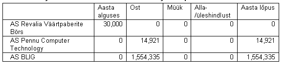 AS Revalia Väärtpaberite börs ei olnud tegev. 30,000 EEK maha kantud. See summa seisab raamatupidamise aastaaruande kirjes Kahjum investeeringute realiseerimises. 1996. aastal soetati 347 Pennu Computer Technology aktsiat 14,921 krooni eest. Ajalehe andmetel oli nende aktsiate keskmine turuhind 1996. aastal majandusaasta bilansipäeval 127 krooni. 1996. a soetati 250,000 AS BLIG aktsiat 1,554,335 krooni eest. Lisa 6. Võlakirjad 12. juulil 1996. aastal soetati 10 Hansa Liisingu võlakirja 100,000 krooni eest. Võlakirjade löunastamistähtaeg on 15. juuli 1997. a. Võlakirjade aastaintress on 8%. 11. novembril 1996. a. soetati 10 Hansa Liisingu võlakirja 100,000 krooni eest. Võlakirjade lunastamistõhtaeg on 4. november 2001.a. Võlakirjade aastaintress on 11%. Lisa 7. Muud laenud Seisuga 31.12.96.a. oli laenude