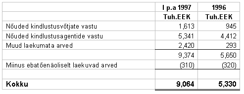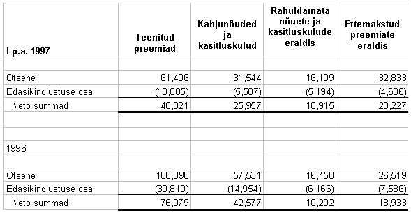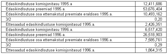 Käesolevaga on eeldatud, et normaalse majandustegevuse korral aeguvad rendilepingud uuendatakse või asendatakse muu vara rentimisega. Amortisatsiooni hulka on arvatud ka kapitalirendiga soetud kulum. Kindlustusalane regulatsioon - Eesti kindlustusalase regulatsiooni järgi peab mitte-elukindlustusega tegelevate kindlustusfirmade miinimum aktsiakapital olema 10,000 tuh.EEK. Lisaks sellele nõuab regulatsioon üld- ja kindlustustehnilise reservi moodustamist. Üldreserv peab võrdne olema aktsiakapitaliga. Üldreservi paigutatakse aastakasumist vähemalt 10%, kuni eelpool nimetatud nõue on täidetud. Firma on paigutanud 55 tuh.EEK üldreservi. Firma on käesolevalt vastuolus Kindlustusinspektsiooni regulatsiooniga, mis piirab investeeringuid teiste kindlustusfirmade aktsiatesse kuni 10 % vastava aktsiaseltsi aktsiakapitalist. Käesoleval ajal omab Firma 14% AS Bligi aktsiakapitalist. Firma juhtkond tegeleb investeeringu osalise müümisega ja nende arvates ei mõjuta nimetaud müük oluliselt Firma finantsmajanduslikku positsiooni. Kohtuprotsessid - Firma on käesoleval ajal seotud tsiviilkohtuprotsessiga Olympian Insurance Company (Olympia) vastu. Kohtuprotsess on seotud Olympia võlgnevuse mittetasumisega kindlustusnõuete osas Firmale vastavalt osalepingule 9. märtsist 1993. a. Olympia koguvõlgnevus Firmale 8,939 tuh.EEK on kajastatud kirjel "Nõuded edasikindlustustegevusest", netoreserv 4,470 tuh. EEK. Firma on võitnud arbitraaž kohtuprotsessi Olympia vastu ja rahade tagasisaamiseks on alustatud protsessi New York'is (i) Olympia ja kahe direktori, Nathan Glik'i ja Stanley Friedman'i, ning teatud seotud firmade vastu ja (ii) Washington'i osariigis Phoenix International Financial Services maakleri ja direktorite Lawrence R. Hoehne ja Joanne Hoehne vastu. Hagi kummagi osapoole vastu on täissummas vastavalt arbitraaž kohtu otsusele 8,939 tuh. EEK pluss arbitraaž kohtukulud 184 tuh.EEK koos intressidega. Lisaks sellele sisaldab hagi trahve. Firma juhtkonna arvab välistele juriidilistele nõuandajatele tuginedes, et nimetatud kohtuprotsessi lõplik lahend ei oma ebasoodsalt materiaalset mõju Firma finantsseisundile. Lisaks sellele, tavalise majandustegevuse käigus, on Firma seotud kohtuprotsessidega vastavalt nõetele seoses kindlustustagatistega, mida on võetud arvesse kindlustushüvitiste reservi moodustamisel. Firma juhtkonna arvates iga lõplik kohustus, mis võib tekkida nimetatud kohtuprotsesside lõpplahendusel, ei oma ebasoodsat materiaalset mõju Firma finantsseisundile. LISA 14: Auditeeritud aastaaruanne 1996, vastavalt IAS-le, inglise keeles INDEPENDENT AUDITORS’ REPORT