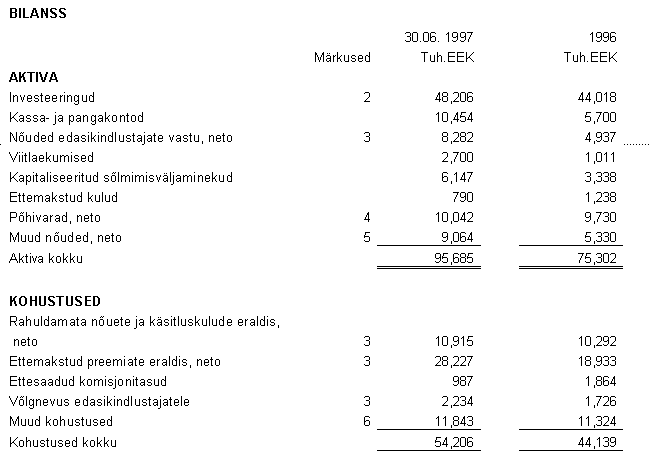 Kokkuvõte 1997. a I poolaastast Võrreldes kogutud brutopreemiaid 1996. a I poolaastal (53.9 miljonit krooni) ja 1997. a I poolaastal (67.7 miljonit krooni), on Emitendi brutopreemiate kasv olnud 25.6%. 1997. a I poolaasta auditeeritud kasum oli 7.3 miljonit krooni, mis moodustab 38.8% aastasest kasumiprognoosist (18.8 miljonit krooni). Bilansimaht 30. juuni seisuga oli 95.7 miljonit krooni ning aktsiakapital 28.9 miljonit krooni. Omakapital moodustas juuni lõpu seisuga 41.5 miljonit krooni, olles kasvanud kuue kuu jooksul enam kui 10 miljoni krooni võrra. Enamik kogutud brutopreemiatest jagunes liiklus- ja ettevõtete vara kindlustusest teenitud preemiate vahel. Liikluskindlustusest kogutud preemiad on saavutanud teatud stabiilsuse ning selle osakaalu vähenemine 65.5 protsendilt 63.7 protsendile näitab vaid teistest kindlustusliikidest kogutud preemiate mahu kasvu. Enim on kasvanud kaskokindlustus – 17.6 protsendilt 20.7 protsendini, mis on tingitud transpordivahendite liisinguturu kasvust. Enamik aastasest kasumiprognoosist planeeritakse teenida aasta teisel poolel, mil kahjukindlustusturg elavneb seoses vanade lepingute lõppemise ning uute sõlmimisega. Teise poolaasta prioriteetideks on kindlustusportfelli ümberstruktrueerimine varakindlustustoodete suunas ning organisatsiooni geograafiline kvalitatiiivne laienemine. LISA 1 : Koondtabel - bilansid 31.12.94, 31.12.95, 31.12.96, 30.06.97