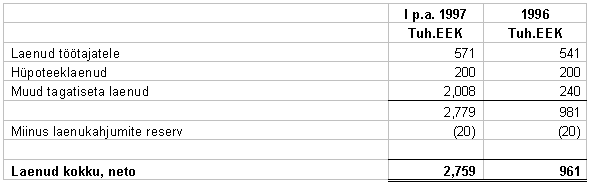 Investeeringud 1997.a. I poolaasta investeeringute nimekirjas on toodud ettevõtte poolt antud laenud summas 2.759 miljonit krooni. Summa koosneb: