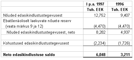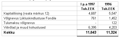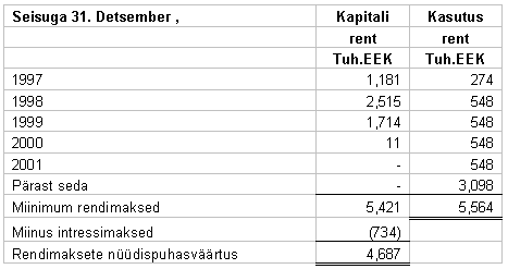 12. POTENTSIAALSED KOHUSTUSED Liising - Firma tegutseb suuremas osas renditud ruumides. Rendikulu 1997. ja 1996. aastal oli vastavalt 1,023 tuh.EEK ja 1,178 tuh.EEK. 30. juuni 1997.a. seisuga minimaalsed potentsiaalsed kohustused tulevikus makstava kapitalirendi ja mitte tühistatava kasutusrendi kulutused on järgnevad: