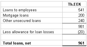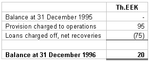 Common stocks at 31 December 1996 consists primarily of common stock of a related company, Blig Life Insurance Company of 1,554 Th. EEK (nominal value 2,500 Th.EEK), which represents 14% of its share capital. (See note 12) Corporate bonds consist of two bonds from Hansa Liising (leasing company) with a maturity of 12 months and an annual interest rate of 8%. At 31 December 1996 the time deposits in financial institutions had maturities from 6 months to 2 years and bear interest between 5.8% and 11%. Loans are composed as follows:
