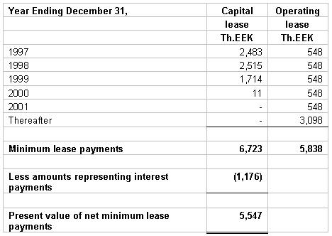 12. COMMITMENTS AND CONTINGENCIES Leases - The Company conducts certain of its operations in leased facilities. Rent expense for 1996 and 1995 was 1,178 Th.EEK and 921 Th.EEK, respectively. At 31 December 1996 future annual minimum commitments under capital and non-cancelable operating leases is as follows: